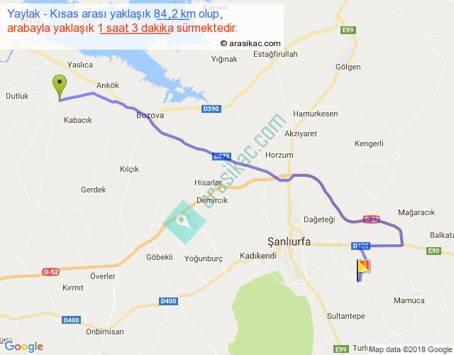 Yaylak - Kısas arası yaklaşık olarak 90 km/h ile yukarıda belirtilen sürede olup, iki yerin kuş uçuşu uzaklığı (mesafesi) 59'dir. Yolculuk otobüsle 1 saat 21 dakika sürmektedir.