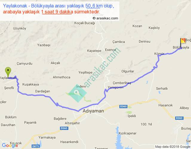 Yaylakonak - Bölükyayla arası yaklaşık olarak 90 km/h ile yukarıda belirtilen sürede olup, iki yerin kuş uçuşu uzaklığı (mesafesi) 35'dir. Yolculuk otobüsle 1 saat 29 dakika sürmektedir.