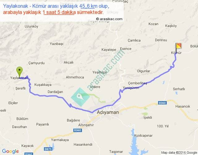 Yaylakonak - Kömür arası yaklaşık olarak 90 km/h ile yukarıda belirtilen sürede olup, iki yerin kuş uçuşu uzaklığı (mesafesi) 31'dir. Yolculuk otobüsle 1 saat 24 dakika sürmektedir.
