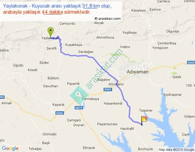 Yaylakonak - Kuyucak arası yaklaşık olarak 90 km/h ile yukarıda belirtilen sürede olup, iki yerin kuş uçuşu uzaklığı (mesafesi) 25'dir. Yolculuk otobüsle 57 dakika sürmektedir.