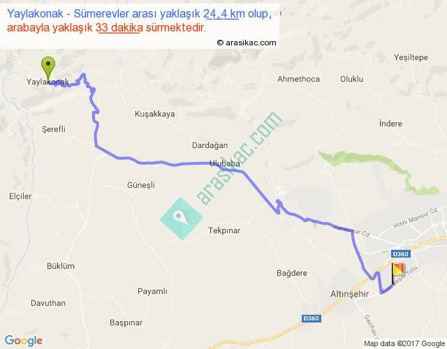 Yaylakonak - Sümerevler arası yaklaşık olarak 90 km/h ile yukarıda belirtilen sürede olup, iki yerin kuş uçuşu uzaklığı (mesafesi) 17'dir. Yolculuk otobüsle 42 dakika sürmektedir.