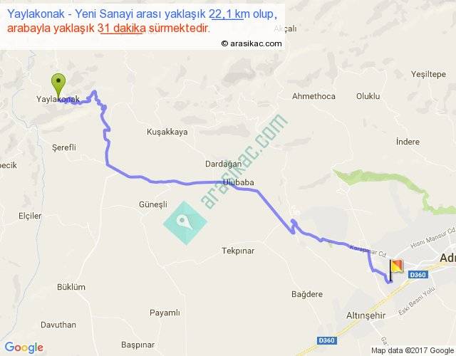 Yaylakonak - Yeni Sanayi arası yaklaşık olarak 90 km/h ile yukarıda belirtilen sürede olup, iki yerin kuş uçuşu uzaklığı (mesafesi) 16'dir. Yolculuk otobüsle 40 dakika sürmektedir.