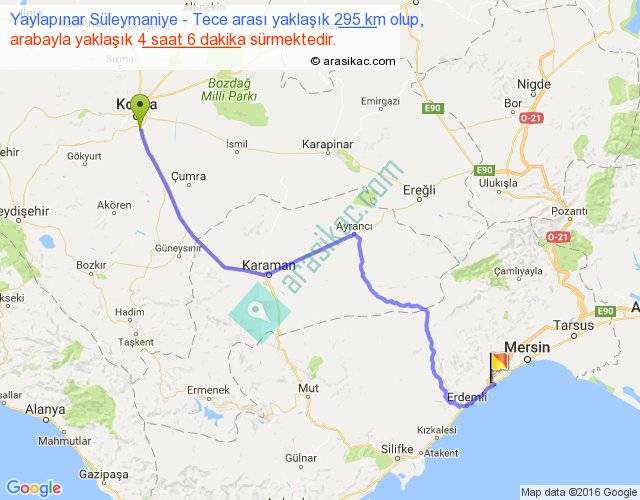 Yaylapınar Süleymaniye - Tece arası yaklaşık olarak 90 km/h ile yukarıda belirtilen sürede olup, iki yerin kuş uçuşu uzaklığı (mesafesi) 209'dir. Yolculuk otobüsle 5 saat 19 dakika sürmektedir.