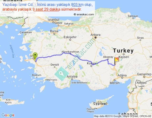 Yazıbaşı İzmir Cd. - İnönü arası yaklaşık olarak 90 km/h ile yukarıda belirtilen sürede olup, iki yerin kuş uçuşu uzaklığı (mesafesi) 643'dir. Eğer belirtilen yerler arasında uçak seferi var ise bu süre uçakla 59 dakika'ya kadar düşebilir. Yolculuk otobüsle 12 saat 19 dakika sürmektedir.