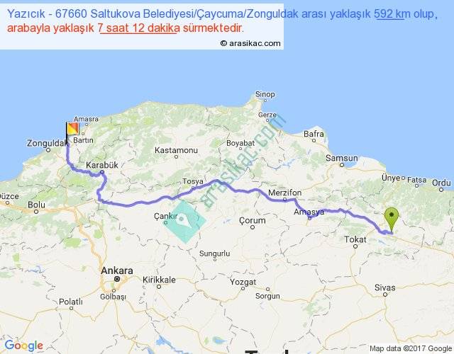 Yazıcık - 67660 Saltukova Belediyesi Çaycuma Zonguldak arası yaklaşık olarak 90 km/h ile yukarıda belirtilen sürede olup, iki yerin kuş uçuşu uzaklığı (mesafesi) 434'dir. Eğer belirtilen yerler arasında uçak seferi var ise bu süre uçakla 40 dakika'ya kadar düşebilir. Yolculuk otobüsle 9 saat 21 dakika sürmektedir.