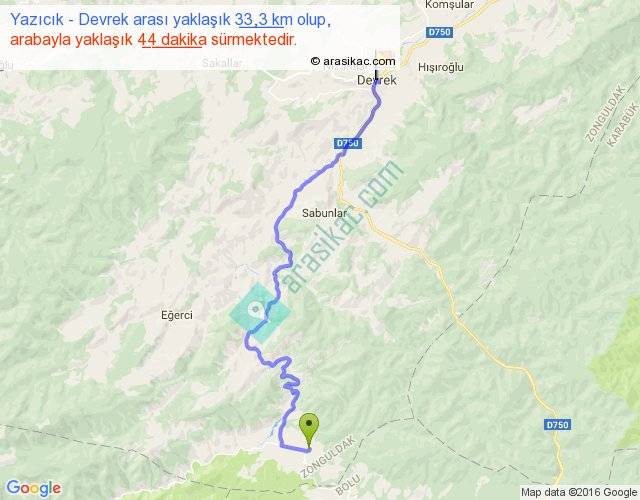 Yazıcık - Devrek arası yaklaşık olarak 90 km/h ile yukarıda belirtilen sürede olup, iki yerin kuş uçuşu uzaklığı (mesafesi) 21'dir. Yolculuk otobüsle 57 dakika sürmektedir.