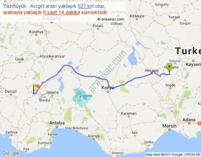 Yazıhüyük - Acıgöl arası yaklaşık olarak 90 km/h ile yukarıda belirtilen sürede olup, iki yerin kuş uçuşu uzaklığı (mesafesi) 416'dir. Eğer belirtilen yerler arasında uçak seferi var ise bu süre uçakla 38 dakika'ya kadar düşebilir. Yolculuk otobüsle 8 saat 6 dakika sürmektedir.
