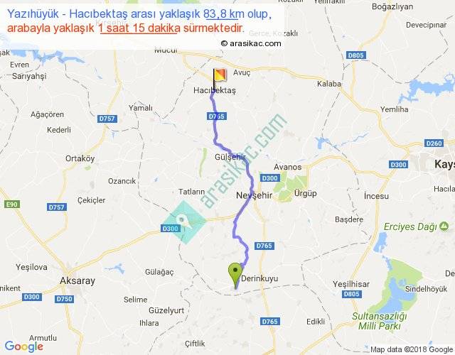 Yazıhüyük - Hacıbektaş arası yaklaşık olarak 90 km/h ile yukarıda belirtilen sürede olup, iki yerin kuş uçuşu uzaklığı (mesafesi) 66'dir. Yolculuk otobüsle 1 saat 37 dakika sürmektedir.