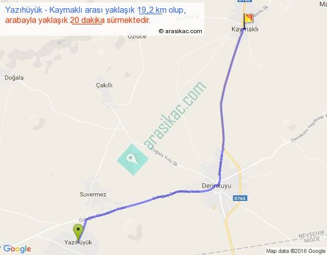 Yazıhüyük - Kaymaklı arası yaklaşık olarak 90 km/h ile yukarıda belirtilen sürede olup, iki yerin kuş uçuşu uzaklığı (mesafesi) 16'dir. Yolculuk otobüsle 26 dakika sürmektedir.