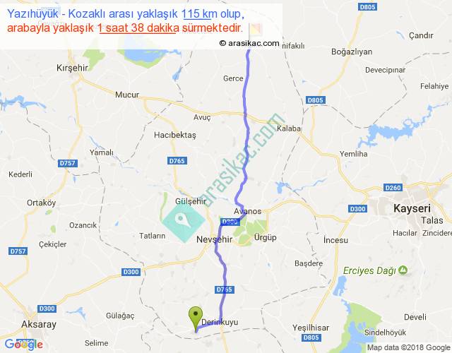 Yazıhüyük - Kozaklı arası yaklaşık olarak 90 km/h ile yukarıda belirtilen sürede olup, iki yerin kuş uçuşu uzaklığı (mesafesi) 98'dir. Yolculuk otobüsle 2 saat 7 dakika sürmektedir.