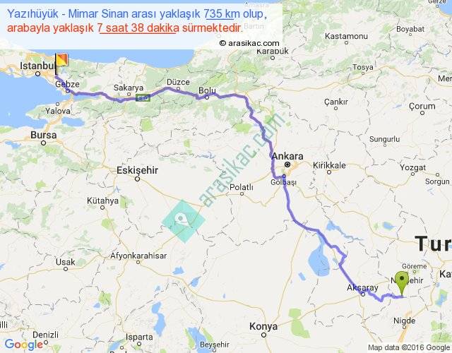 Yazıhüyük - Mimar Sinan arası yaklaşık olarak 90 km/h ile yukarıda belirtilen sürede olup, iki yerin kuş uçuşu uzaklığı (mesafesi) 543'dir. Eğer belirtilen yerler arasında uçak seferi var ise bu süre uçakla 50 dakika'ya kadar düşebilir. Yolculuk otobüsle 9 saat 55 dakika sürmektedir.