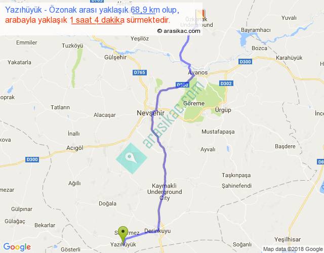 Yazıhüyük - Özonak arası yaklaşık olarak 90 km/h ile yukarıda belirtilen sürede olup, iki yerin kuş uçuşu uzaklığı (mesafesi) 54'dir. Yolculuk otobüsle 1 saat 23 dakika sürmektedir.