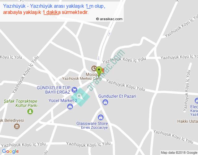 Yazıhüyük - Yazıhüyük arası yaklaşık olarak 90 km/h ile yukarıda belirtilen sürede olup, iki yerin kuş uçuşu uzaklığı (mesafesi) 0'dir. Yolculuk otobüsle 1 dakika sürmektedir.