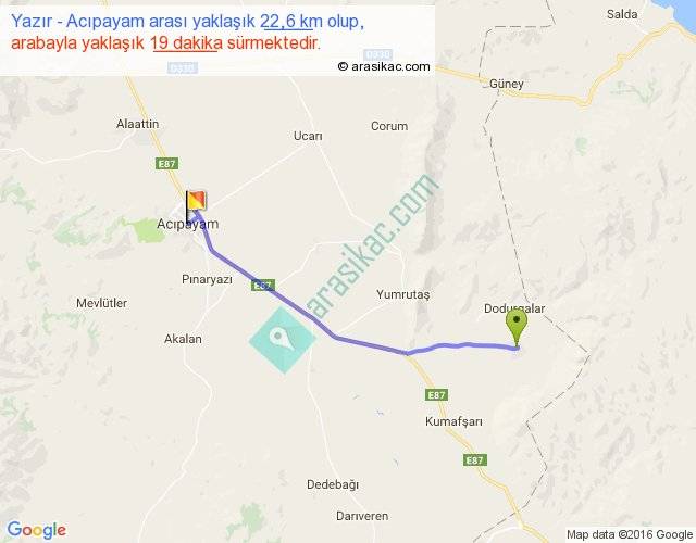 Yazır - Acıpayam arası yaklaşık olarak 90 km/h ile yukarıda belirtilen sürede olup, iki yerin kuş uçuşu uzaklığı (mesafesi) 20'dir. Yolculuk otobüsle 24 dakika sürmektedir.