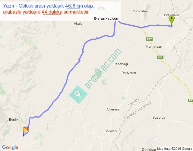 Yazır - Gölcük arası yaklaşık olarak 90 km/h ile yukarıda belirtilen sürede olup, iki yerin kuş uçuşu uzaklığı (mesafesi) 37'dir. Yolculuk otobüsle 57 dakika sürmektedir.