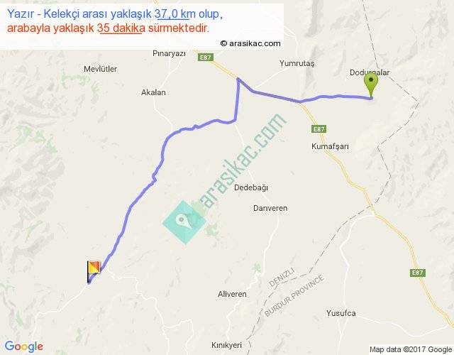 Yazır - Kelekçi arası yaklaşık olarak 90 km/h ile yukarıda belirtilen sürede olup, iki yerin kuş uçuşu uzaklığı (mesafesi) 29'dir. Yolculuk otobüsle 45 dakika sürmektedir.