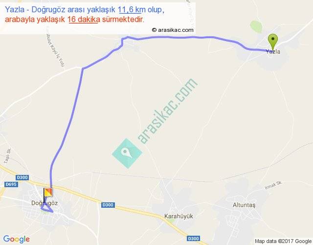 Yazla - Doğrugöz arası yaklaşık olarak 90 km/h ile yukarıda belirtilen sürede olup, iki yerin kuş uçuşu uzaklığı (mesafesi) 8'dir. Yolculuk otobüsle 20 dakika sürmektedir.