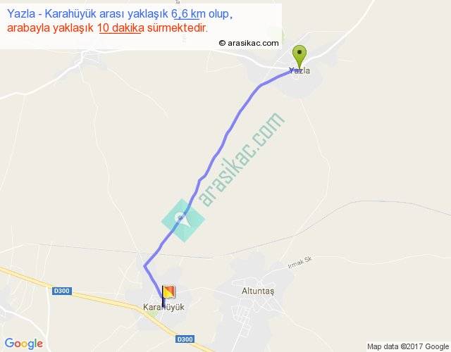 Yazla - Karahüyük arası yaklaşık olarak 90 km/h ile yukarıda belirtilen sürede olup, iki yerin kuş uçuşu uzaklığı (mesafesi) 6'dir. Yolculuk otobüsle 13 dakika sürmektedir.