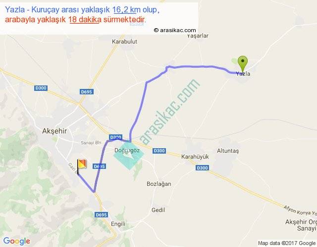 Yazla - Kuruçay arası yaklaşık olarak 90 km/h ile yukarıda belirtilen sürede olup, iki yerin kuş uçuşu uzaklığı (mesafesi) 12'dir. Yolculuk otobüsle 23 dakika sürmektedir.