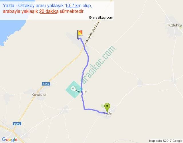 Yazla - Ortaköy arası yaklaşık olarak 90 km/h ile yukarıda belirtilen sürede olup, iki yerin kuş uçuşu uzaklığı (mesafesi) 8'dir. Yolculuk otobüsle 26 dakika sürmektedir.