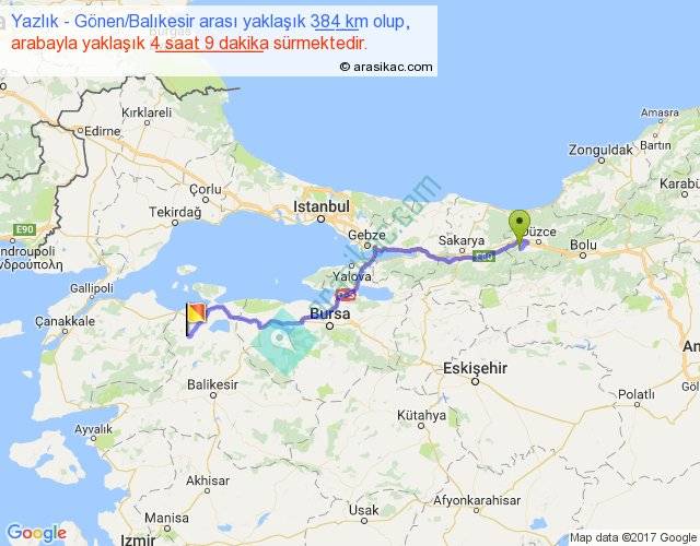 Yazlık - Gönen Balıkesir arası yaklaşık olarak 90 km/h ile yukarıda belirtilen sürede olup, iki yerin kuş uçuşu uzaklığı (mesafesi) 290'dir. Eğer belirtilen yerler arasında uçak seferi var ise bu süre uçakla 26 dakika'ya kadar düşebilir. Yolculuk otobüsle 5 saat 23 dakika sürmektedir.