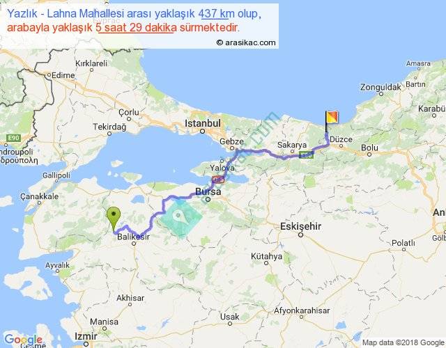 Yazlık - Lahna Mahallesi arası yaklaşık olarak 90 km/h ile yukarıda belirtilen sürede olup, iki yerin kuş uçuşu uzaklığı (mesafesi) 312'dir. Eğer belirtilen yerler arasında uçak seferi var ise bu süre uçakla 28 dakika'ya kadar düşebilir. Yolculuk otobüsle 7 saat 7 dakika sürmektedir.