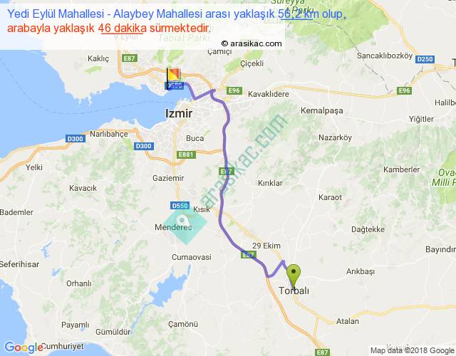 Yedi Eylül Mahallesi - Alaybey Mahallesi arası yaklaşık olarak 90 km/h ile yukarıda belirtilen sürede olup, iki yerin kuş uçuşu uzaklığı (mesafesi) 40'dir. Yolculuk otobüsle 59 dakika sürmektedir.