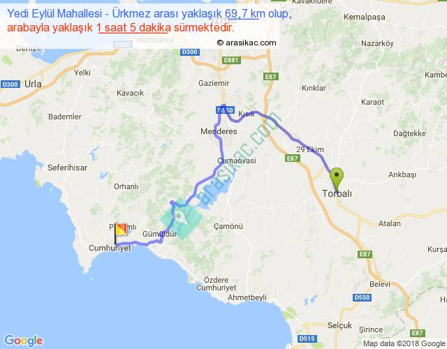Yedi Eylül Mahallesi - Ürkmez arası yaklaşık olarak 90 km/h ile yukarıda belirtilen sürede olup, iki yerin kuş uçuşu uzaklığı (mesafesi) 39'dir. Yolculuk otobüsle 1 saat 24 dakika sürmektedir.