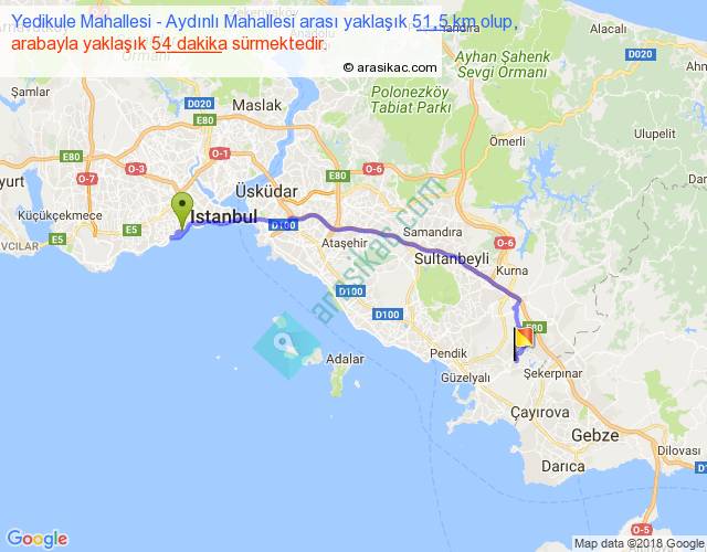 Yedikule Mahallesi - Aydınlı Mahallesi arası yaklaşık olarak 90 km/h ile yukarıda belirtilen sürede olup, iki yerin kuş uçuşu uzaklığı (mesafesi) 37'dir. Yolculuk otobüsle 1 saat 10 dakika sürmektedir.