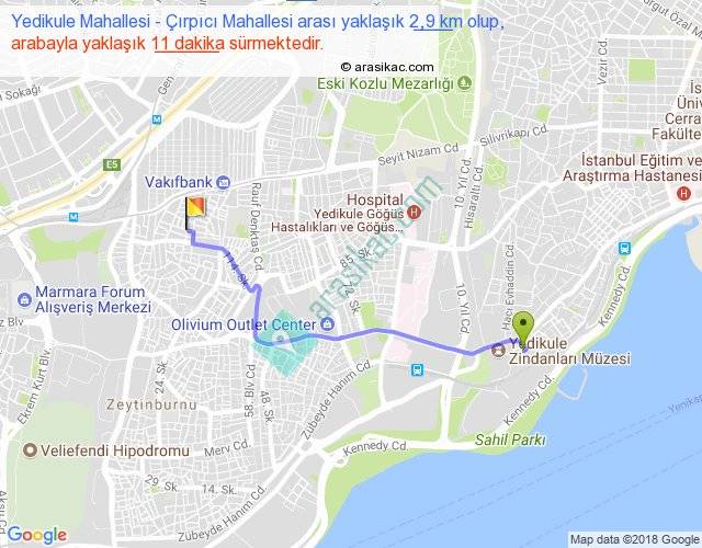 Yedikule Mahallesi - Çırpıcı Mahallesi arası yaklaşık olarak 90 km/h ile yukarıda belirtilen sürede olup, iki yerin kuş uçuşu uzaklığı (mesafesi) 2'dir. Yolculuk otobüsle 14 dakika sürmektedir.