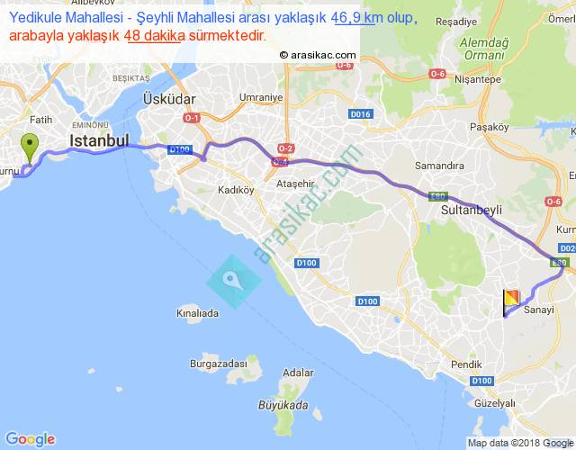 Yedikule Mahallesi - Şeyhli Mahallesi arası yaklaşık olarak 90 km/h ile yukarıda belirtilen sürede olup, iki yerin kuş uçuşu uzaklığı (mesafesi) 32'dir. Yolculuk otobüsle 1 saat 2 dakika sürmektedir.
