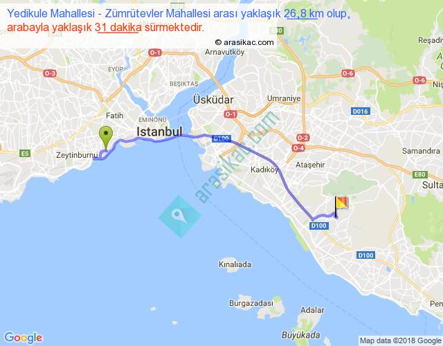Yedikule Mahallesi - Zümrütevler Mahallesi arası yaklaşık olarak 90 km/h ile yukarıda belirtilen sürede olup, iki yerin kuş uçuşu uzaklığı (mesafesi) 20'dir. Yolculuk otobüsle 40 dakika sürmektedir.