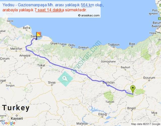 Yedisu - Gaziosmanpaşa Mh. arası yaklaşık olarak 90 km/h ile yukarıda belirtilen sürede olup, iki yerin kuş uçuşu uzaklığı (mesafesi) 406'dir. Eğer belirtilen yerler arasında uçak seferi var ise bu süre uçakla 37 dakika'ya kadar düşebilir. Yolculuk otobüsle 9 saat 24 dakika sürmektedir.
