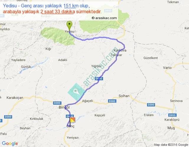 Yedisu - Genç arası yaklaşık olarak 90 km/h ile yukarıda belirtilen sürede olup, iki yerin kuş uçuşu uzaklığı (mesafesi) 76'dir. Yolculuk otobüsle 3 saat 18 dakika sürmektedir.