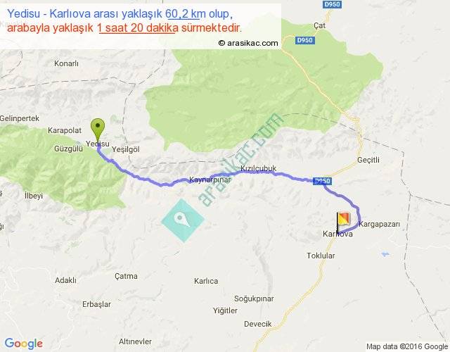 Yedisu - Karlıova arası yaklaşık olarak 90 km/h ile yukarıda belirtilen sürede olup, iki yerin kuş uçuşu uzaklığı (mesafesi) 43'dir. Yolculuk otobüsle 1 saat 44 dakika sürmektedir.