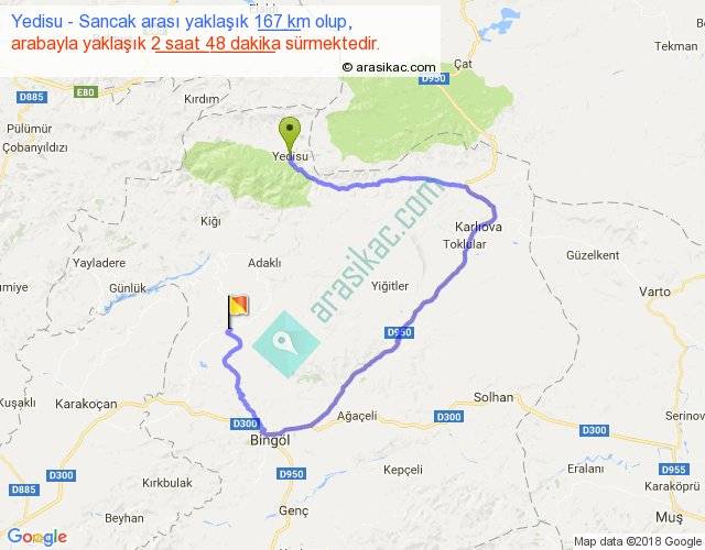 Yedisu - Sancak arası yaklaşık olarak 90 km/h ile yukarıda belirtilen sürede olup, iki yerin kuş uçuşu uzaklığı (mesafesi) 39'dir. Yolculuk otobüsle 3 saat 38 dakika sürmektedir.