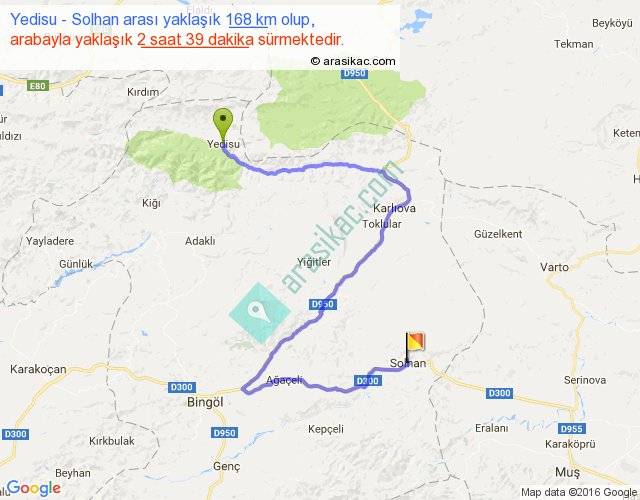 Yedisu - Solhan arası yaklaşık olarak 90 km/h ile yukarıda belirtilen sürede olup, iki yerin kuş uçuşu uzaklığı (mesafesi) 67'dir. Yolculuk otobüsle 3 saat 26 dakika sürmektedir.