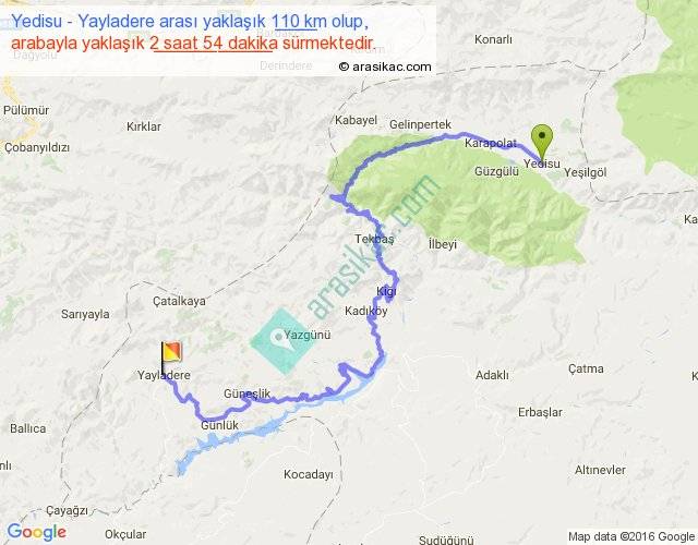 Yedisu - Yayladere arası yaklaşık olarak 90 km/h ile yukarıda belirtilen sürede olup, iki yerin kuş uçuşu uzaklığı (mesafesi) 47'dir. Yolculuk otobüsle 3 saat 46 dakika sürmektedir.