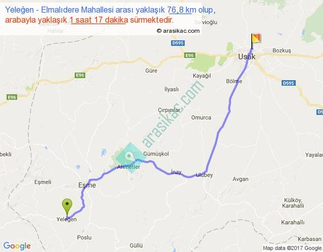 Yeleğen - Elmalıdere Mahallesi arası yaklaşık olarak 90 km/h ile yukarıda belirtilen sürede olup, iki yerin kuş uçuşu uzaklığı (mesafesi) 59'dir. Yolculuk otobüsle 1 saat 40 dakika sürmektedir.