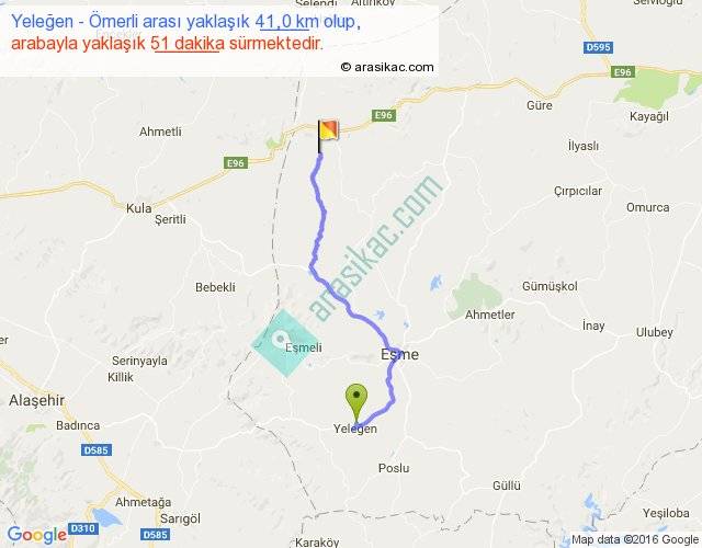 Yeleğen - Ömerli arası yaklaşık olarak 90 km/h ile yukarıda belirtilen sürede olup, iki yerin kuş uçuşu uzaklığı (mesafesi) 29'dir. Yolculuk otobüsle 1 saat 6 dakika sürmektedir.