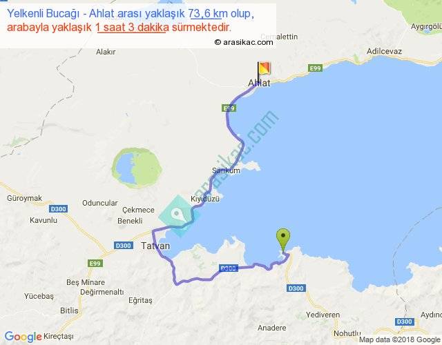 Yelkenli Bucağı - Ahlat arası yaklaşık olarak 90 km/h ile yukarıda belirtilen sürede olup, iki yerin kuş uçuşu uzaklığı (mesafesi) 30'dir. Yolculuk otobüsle 1 saat 21 dakika sürmektedir.