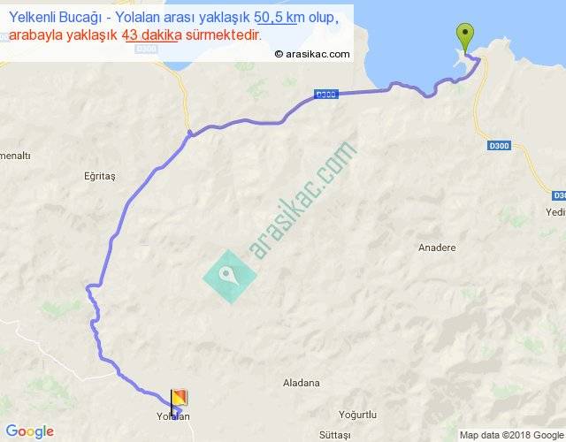Yelkenli Bucağı - Yolalan arası yaklaşık olarak 90 km/h ile yukarıda belirtilen sürede olup, iki yerin kuş uçuşu uzaklığı (mesafesi) 31'dir. Yolculuk otobüsle 55 dakika sürmektedir.