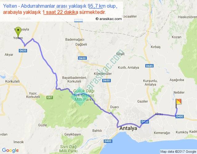 Yelten - Abdurrahmanlar arası yaklaşık olarak 90 km/h ile yukarıda belirtilen sürede olup, iki yerin kuş uçuşu uzaklığı (mesafesi) 68'dir. Yolculuk otobüsle 1 saat 46 dakika sürmektedir.
