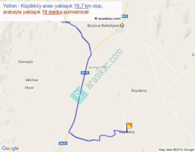 Yelten - Küçükköy arası yaklaşık olarak 90 km/h ile yukarıda belirtilen sürede olup, iki yerin kuş uçuşu uzaklığı (mesafesi) 13'dir. Yolculuk otobüsle 23 dakika sürmektedir.