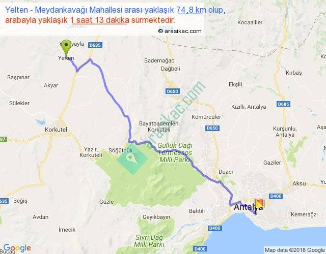 Yelten - Meydankavağı Mahallesi arası yaklaşık olarak 90 km/h ile yukarıda belirtilen sürede olup, iki yerin kuş uçuşu uzaklığı (mesafesi) 58'dir. Yolculuk otobüsle 1 saat 34 dakika sürmektedir.