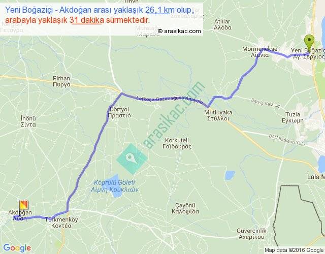 Yeni Boğaziçi - Akdoğan arası yaklaşık olarak 90 km/h ile yukarıda belirtilen sürede olup, iki yerin kuş uçuşu uzaklığı (mesafesi) 20'dir. Yolculuk otobüsle 40 dakika sürmektedir.