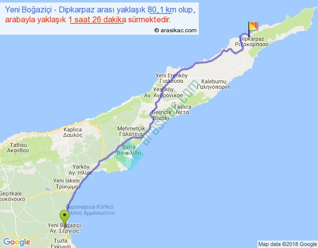 Yeni Boğaziçi - Dipkarpaz arası yaklaşık olarak 90 km/h ile yukarıda belirtilen sürede olup, iki yerin kuş uçuşu uzaklığı (mesafesi) 66'dir. Yolculuk otobüsle 1 saat 51 dakika sürmektedir.