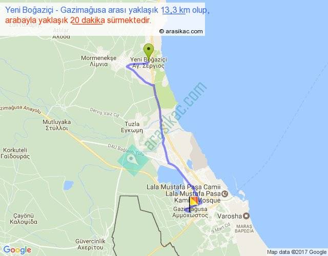 Yeni Boğaziçi - Gazimağusa arası yaklaşık olarak 90 km/h ile yukarıda belirtilen sürede olup, iki yerin kuş uçuşu uzaklığı (mesafesi) 9'dir. Yolculuk otobüsle 26 dakika sürmektedir.