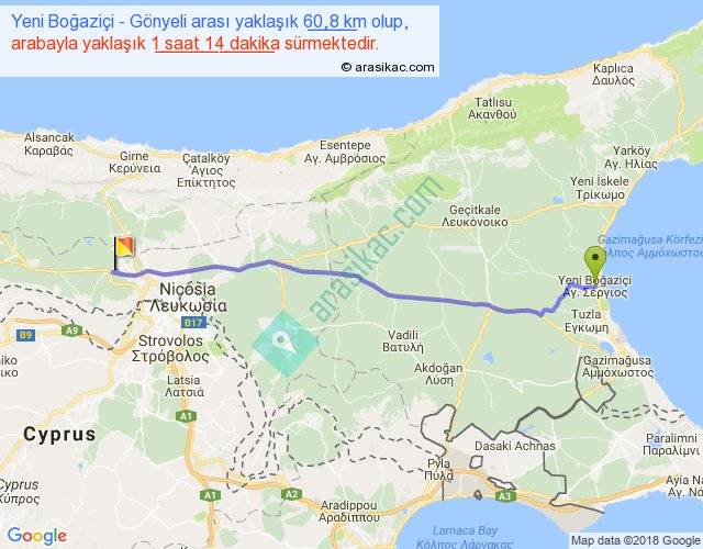 Yeni Boğaziçi - Gönyeli arası yaklaşık olarak 90 km/h ile yukarıda belirtilen sürede olup, iki yerin kuş uçuşu uzaklığı (mesafesi) 54'dir. Yolculuk otobüsle 1 saat 36 dakika sürmektedir.
