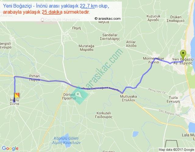Yeni Boğaziçi - İnönü arası yaklaşık olarak 90 km/h ile yukarıda belirtilen sürede olup, iki yerin kuş uçuşu uzaklığı (mesafesi) 18'dir. Yolculuk otobüsle 32 dakika sürmektedir.